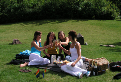 med mousserande vin, ost och kex. Där satt vi sedan i solen